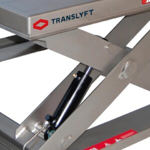 All Translyft stainless steel lifting machines are equipped with platform, base frame and scissors made of stainless steel AISI 304/1.4301, the surface is glass blasted. Shafts, wheels and bolts AISI 303/1.4305. Fittings and tubes are stainless steel AISI 316/1.4401 and safety frame made of aluminum. The power unit is covered by a stainless plate. Return pipe(s) from cylinder(s) to tank, with the exception of the all super low models, TR 500 and TRD 500 as there is no room for it.