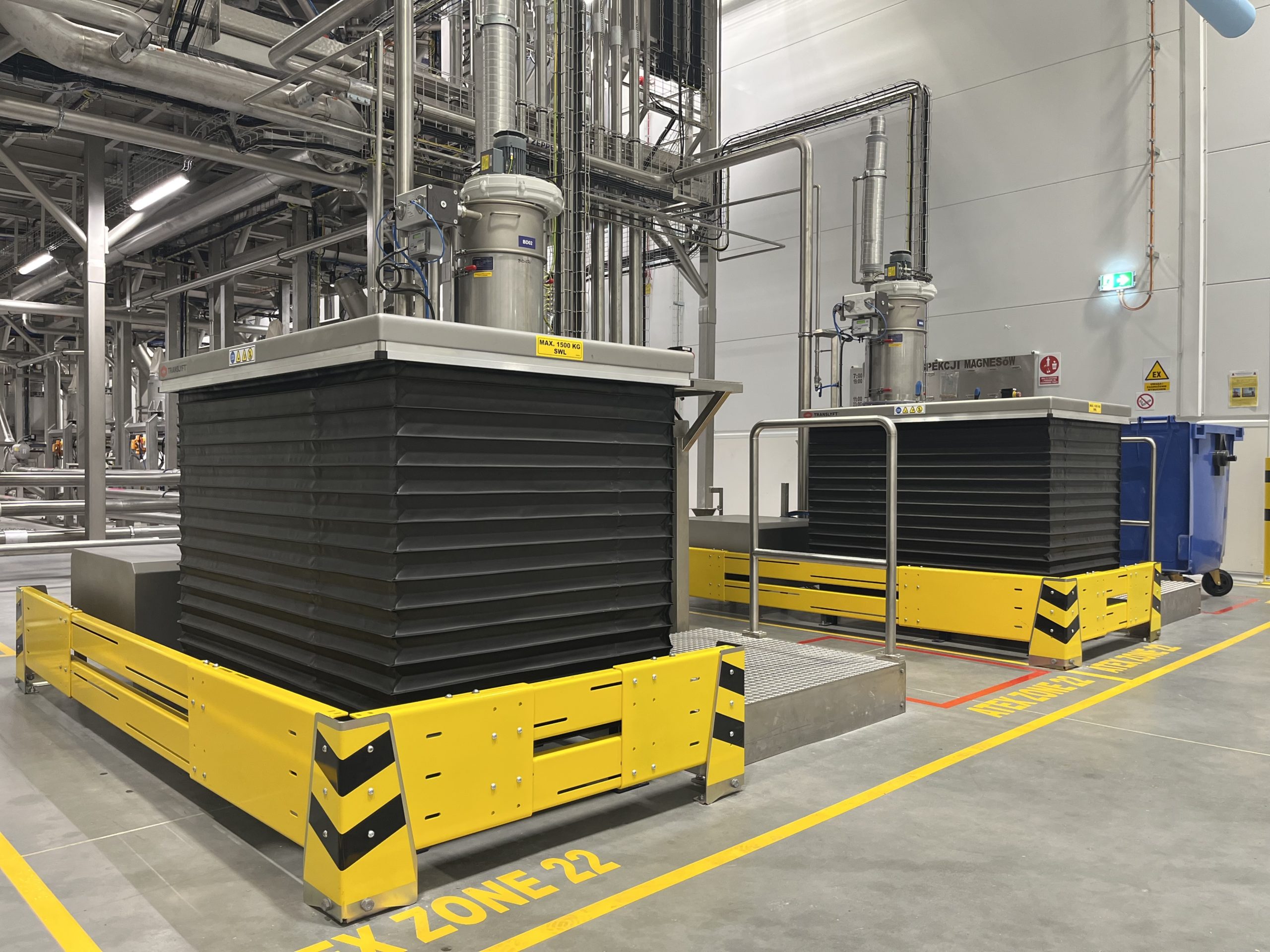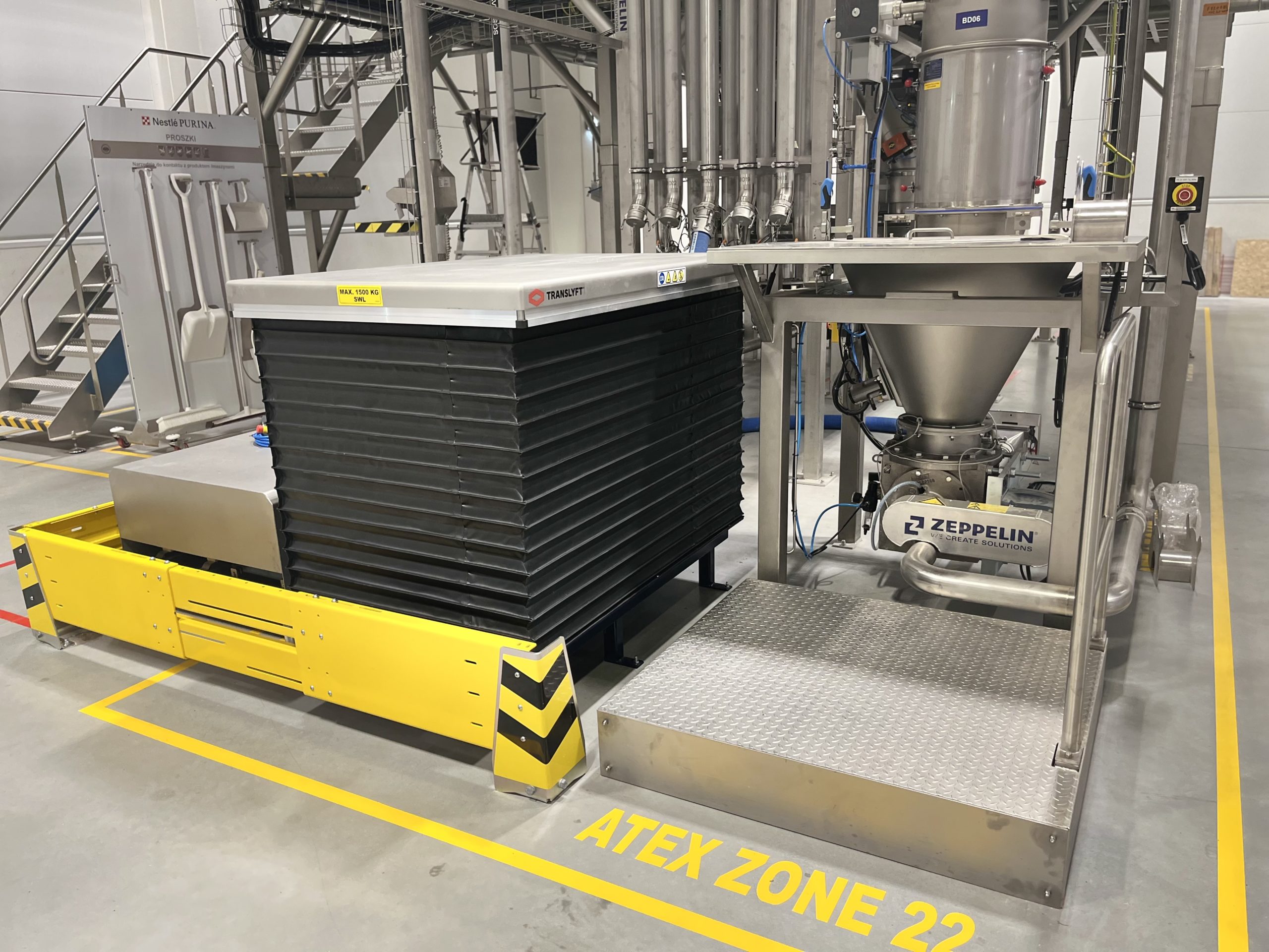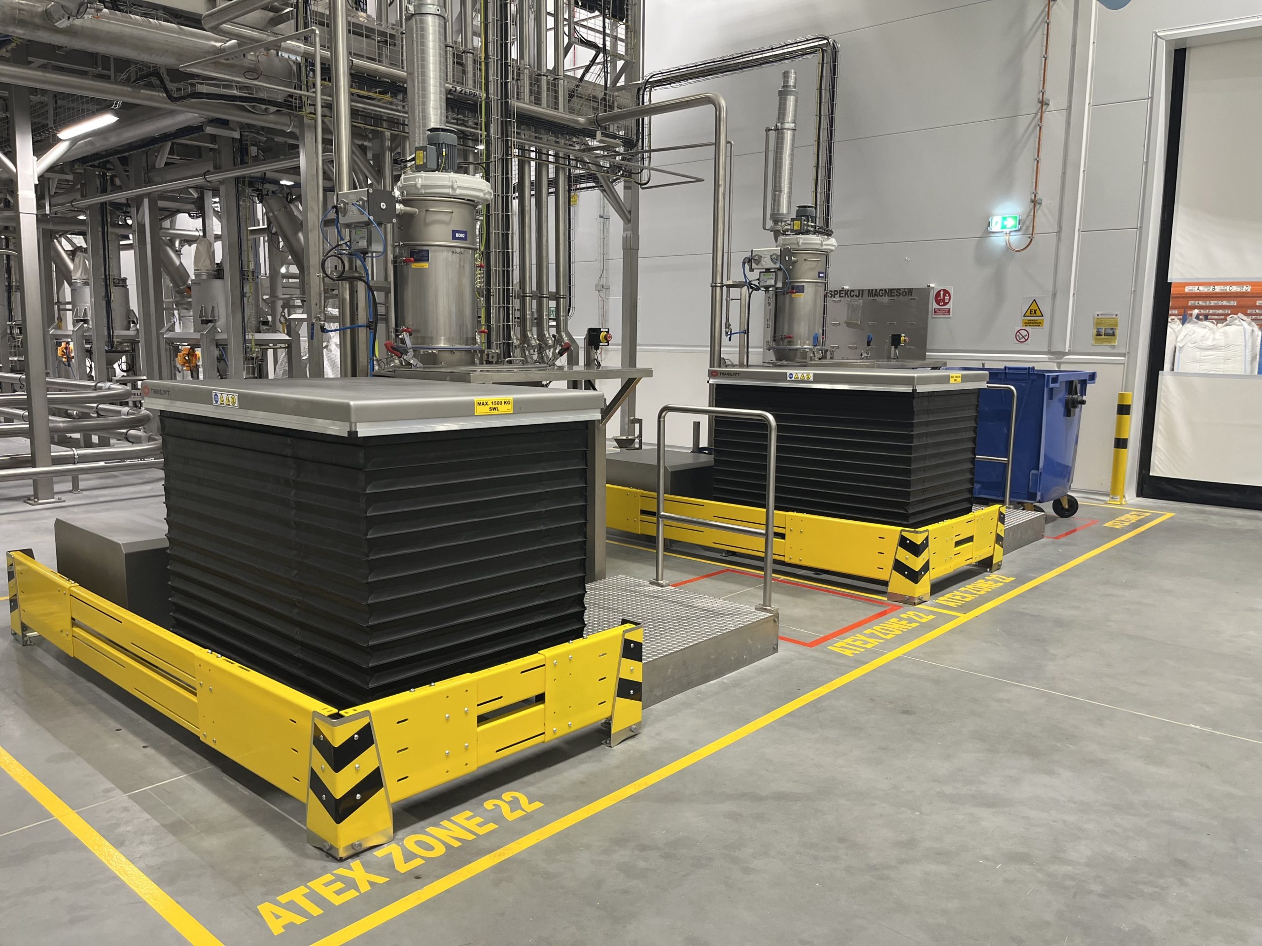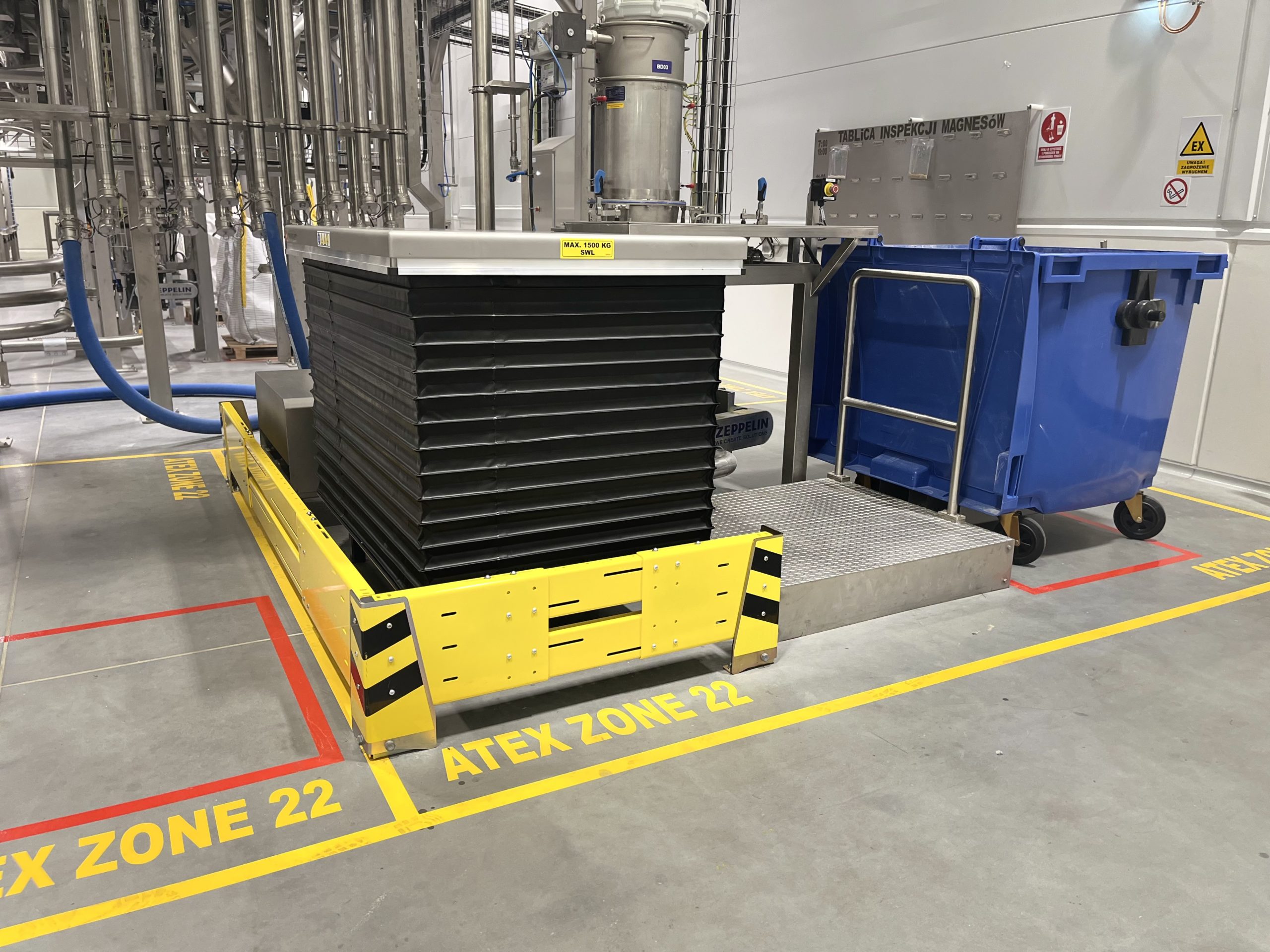 Urządzenia Transportu Bliskiego przeznaczone do pracy w strefach zagrożonych wybuchem to zawsze wymagające aplikacje. Ten przypadek nie jest wyjątkiem. Wszystkie komponenty urządzenia są dostosowane do pracy w określonej atmosferze wybuchowej. Dostarczone urządzenia stanowiły podstawowe wyposażenie ergonomicznego stanowiska pracy do załadunku półproduktów, więc już na samym początku procesu produkcyjnego. Wymagany udźwig 1500 kg zadecydował o wyborze modelu stołu podnośnego TL2000 – niezwykle stabilnego, dopracowanego i flagowego modelu z rodziny pojedynczych nożyc TRANSLYFT. Ponieważ do pozycjonowania palet z półproduktami na podnośniku stosuje się elektryczne wózki widłowe z nogami przednimi (aby umieścić paletę na platformie podnośnika, nogi wózka widłowego muszą wjechać pod podnośnik), do aplikacji dodano specjalną ramę nośną FLT wyposażoną w sześć stóp kotwionych do posadzki, Rama FLT umożliwia wjazd wózka widłowego pod rękaw podnośnika. Platforma podnośnika hydraulicznego wykonana jest ze stali nierdzewnej AISI 304/1.4301 szkiełkowanej o wymiarach: 1450x1000 mm; skok nożyc: 820 mm; wysokość spoczynku: 410 mm (podnośnik 210 mm + rama nośna FLT 200 mm); maksymalna wysokość podnoszenia: 1230 mm; czas podnoszenia: 25 sekund; zastosowano siłownik hydrauliczny typu II, tj. tłoczysko i wszystkie przyłącza hydrauliczne wykonane są ze stali nierdzewnej AISI 316/1.4401; rura siłownika jest piaskowana, pokryta podkładem antykorozyjnym i pomalowana dwuskładnikowym lakierem poliuretanowym. Dodatkowo zainstalowano osłonę mieszkową nożyc PCV, specjalnie dostosowaną do pracy w strefach EX. Na uwagę zasługuje również wolnostojący zespół elektrohydrauliczny podnośnika. Kompletna jednostka zasilająca jest oddzielona od stołu podnoszącego. Wszystkie podzespoły elektryczne umieszczono w szczelnie zamkniętej żeliwnej obudowie. Wszystkie porty kablowe są dodatkowo uszczelnione specjalną pastą. Całość chroni solidna obudowa, również wykonana ze stali nierdzewnej szkiełkowanej. Aby zabezpieczyć urządzenie (zarówno windę, jak i jednostkę), zastosowano wielorazowy panel odbojowy (z wbudowanym systemem SIS łączącym podstawę z osłoną), składający się z narożnych odbojników FAS oraz panelu antykolizyjnego RSP. Kompletny panel odbojny RSP plus zapewnia bardzo solidną ochronę antykolizyjną z wytrzymałością na uderzenia przekraczającą 400 Nm. To ergonomiczne stanowisko pracy nie tylko świetnie wygląda, ale jest również absolutnie najlepszym technicznie rozwiązaniem dostępnym obecnie na rynku. Mocno polecane dla wszystkich ergonomicznych aplikacji w strefach wybuchowych ATEX.