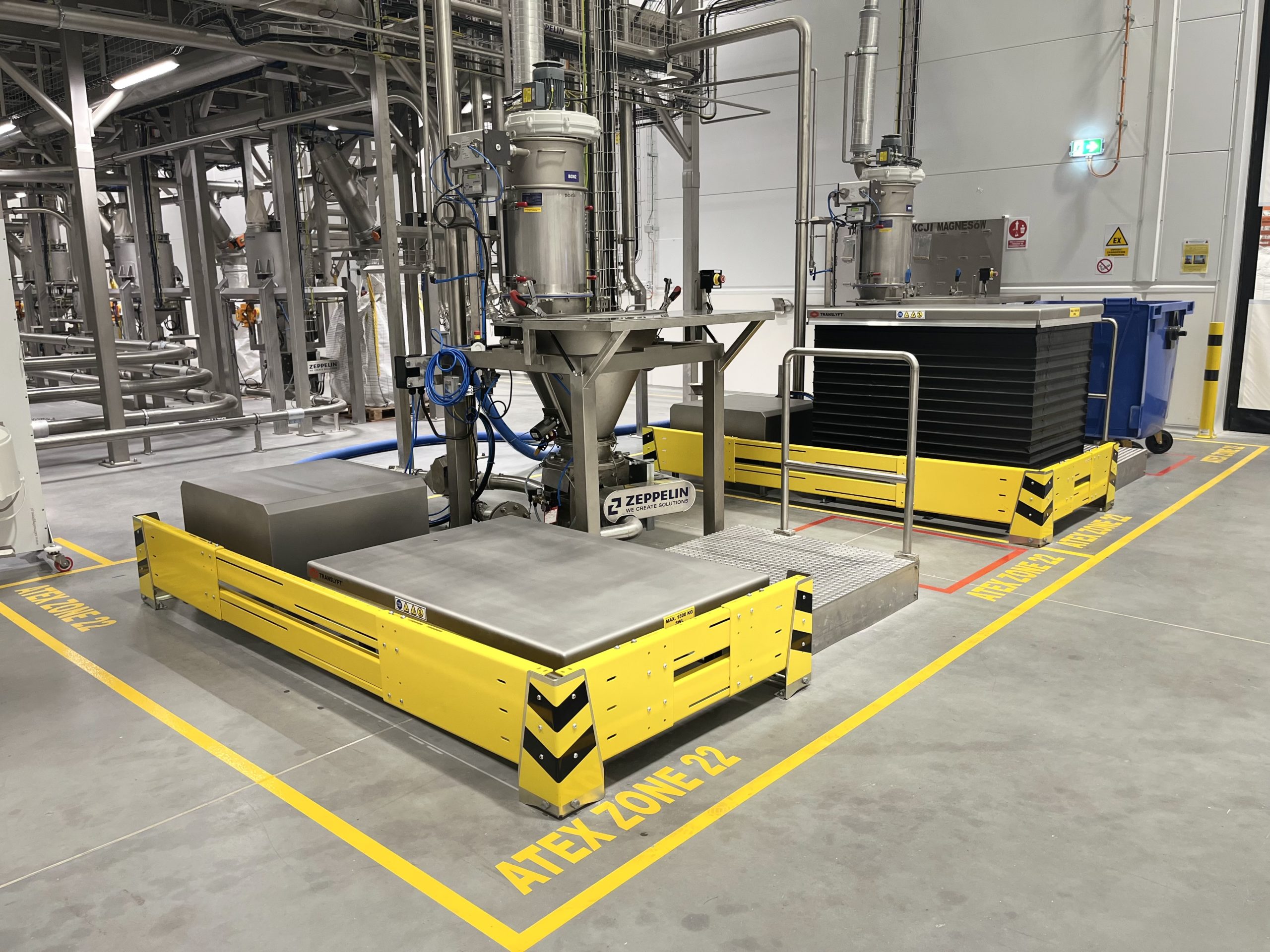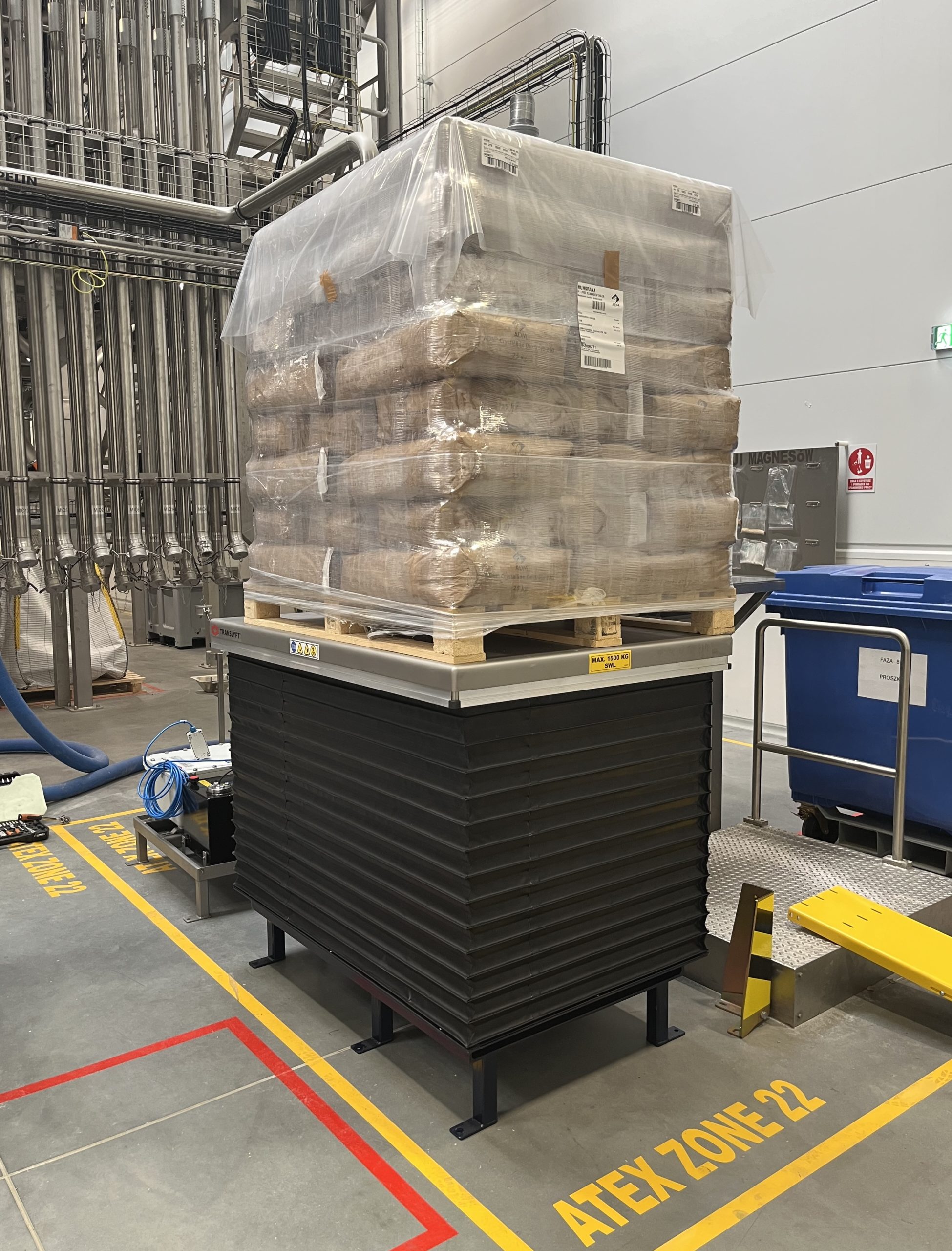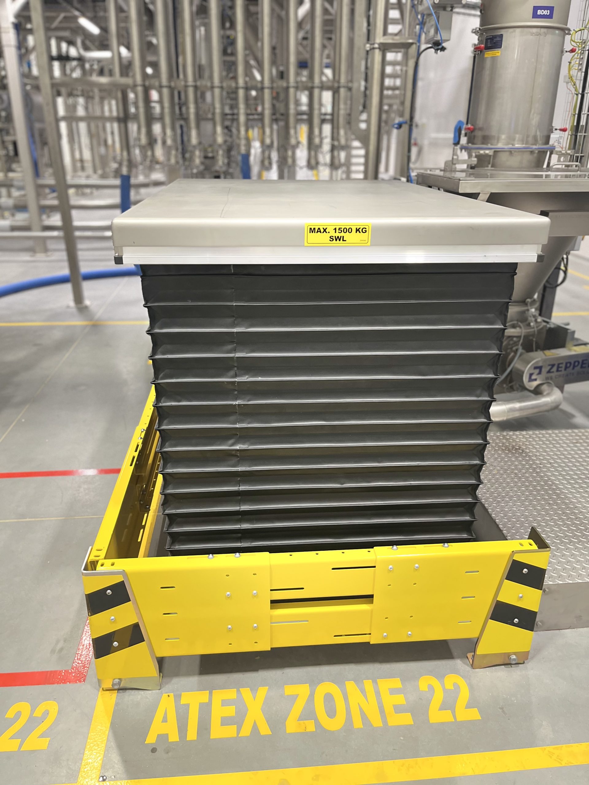 Urządzenia Transportu Bliskiego przeznaczone do pracy w strefach zagrożonych wybuchem to zawsze wymagające aplikacje. Ten przypadek nie jest wyjątkiem. Wszystkie komponenty urządzenia są dostosowane do pracy w określonej atmosferze wybuchowej. Dostarczone urządzenia stanowiły podstawowe wyposażenie ergonomicznego stanowiska pracy do załadunku półproduktów, więc już na samym początku procesu produkcyjnego. Wymagany udźwig 1500 kg zadecydował o wyborze modelu stołu podnośnego TL2000 – niezwykle stabilnego, dopracowanego i flagowego modelu z rodziny pojedynczych nożyc TRANSLYFT. Ponieważ do pozycjonowania palet z półproduktami na podnośniku stosuje się elektryczne wózki widłowe z nogami przednimi (aby umieścić paletę na platformie podnośnika, nogi wózka widłowego muszą wjechać pod podnośnik), do aplikacji dodano specjalną ramę nośną FLT wyposażoną w sześć stóp kotwionych do posadzki, Rama FLT umożliwia wjazd wózka widłowego pod rękaw podnośnika. Platforma podnośnika hydraulicznego wykonana jest ze stali nierdzewnej AISI 304/1.4301 szkiełkowanej o wymiarach: 1450x1000 mm; skok nożyc: 820 mm; wysokość spoczynku: 410 mm (podnośnik 210 mm + rama nośna FLT 200 mm); maksymalna wysokość podnoszenia: 1230 mm; czas podnoszenia: 25 sekund; zastosowano siłownik hydrauliczny typu II, tj. tłoczysko i wszystkie przyłącza hydrauliczne wykonane są ze stali nierdzewnej AISI 316/1.4401; rura siłownika jest piaskowana, pokryta podkładem antykorozyjnym i pomalowana dwuskładnikowym lakierem poliuretanowym. Dodatkowo zainstalowano osłonę mieszkową nożyc PCV, specjalnie dostosowaną do pracy w strefach EX. Na uwagę zasługuje również wolnostojący zespół elektrohydrauliczny podnośnika. Kompletna jednostka zasilająca jest oddzielona od stołu podnoszącego. Wszystkie podzespoły elektryczne umieszczono w szczelnie zamkniętej żeliwnej obudowie. Wszystkie porty kablowe są dodatkowo uszczelnione specjalną pastą. Całość chroni solidna obudowa, również wykonana ze stali nierdzewnej szkiełkowanej. Aby zabezpieczyć urządzenie (zarówno windę, jak i jednostkę), zastosowano wielorazowy panel odbojowy (z wbudowanym systemem SIS łączącym podstawę z osłoną), składający się z narożnych odbojników FAS oraz panelu antykolizyjnego RSP. Kompletny panel odbojny RSP plus zapewnia bardzo solidną ochronę antykolizyjną z wytrzymałością na uderzenia przekraczającą 400 Nm. To ergonomiczne stanowisko pracy nie tylko świetnie wygląda, ale jest również absolutnie najlepszym technicznie rozwiązaniem dostępnym obecnie na rynku. Mocno polecane dla wszystkich ergonomicznych aplikacji w strefach wybuchowych ATEX.
