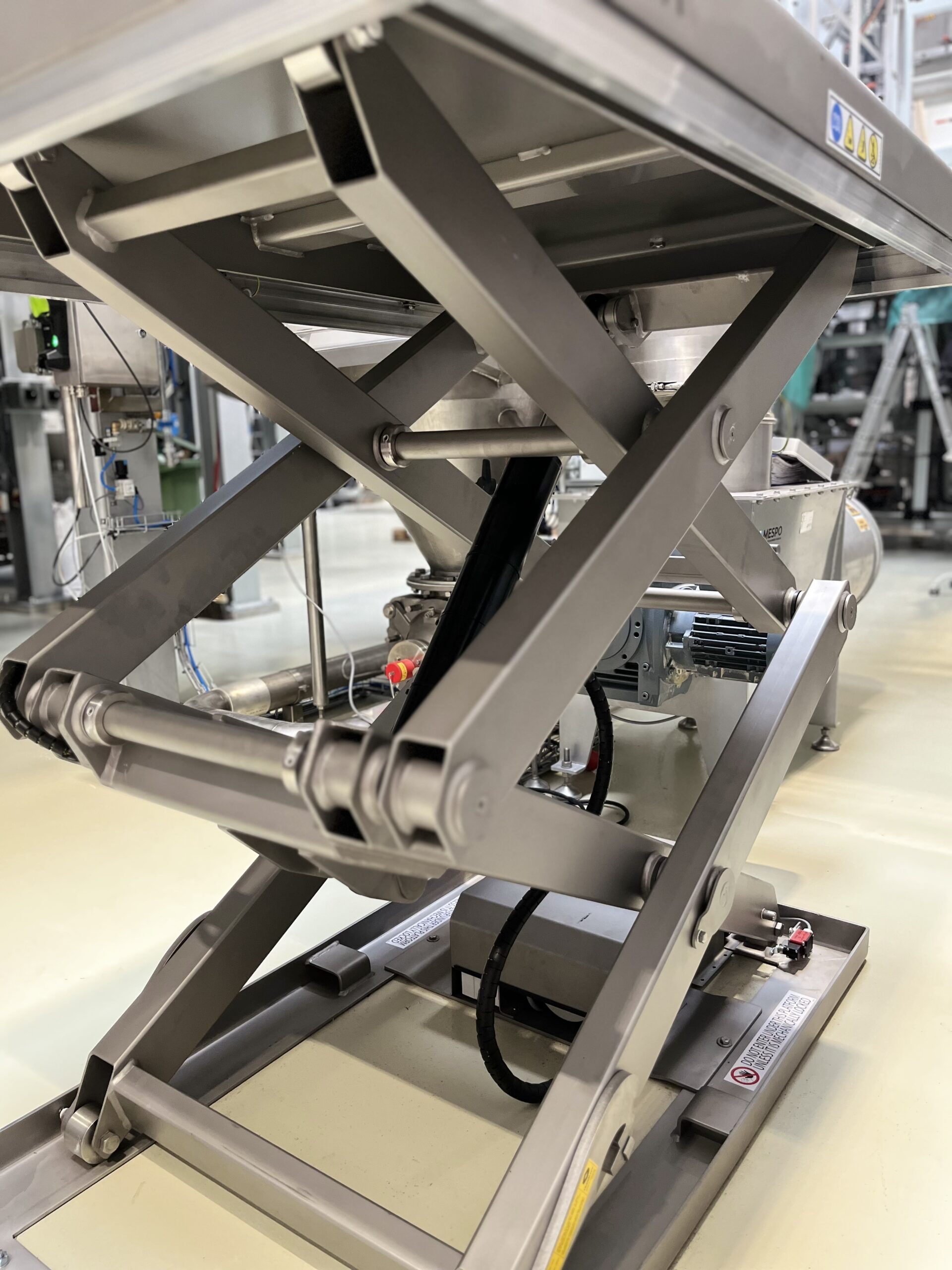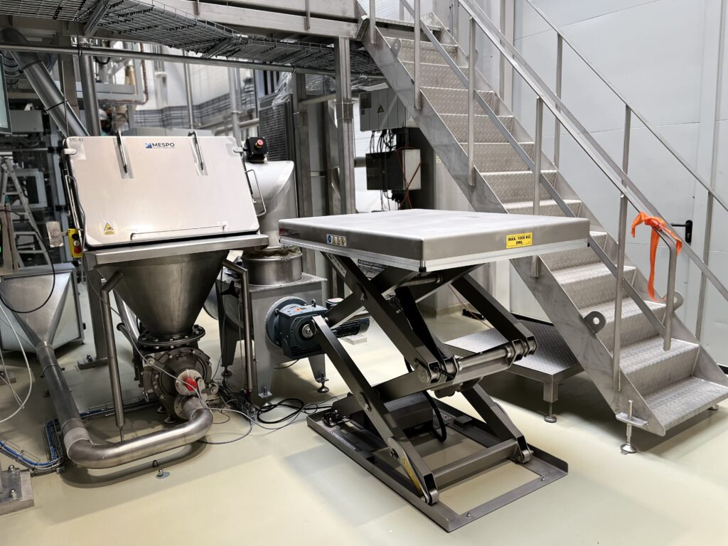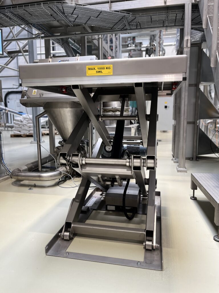 Projekt obejmował wybór, dostawę, instalację i uruchomienie odpowiedniego nożycowego stołu podnośnego dla ergonomicznego stanowiska roboczego w celu łatwego pobierania spaletyzowanego półproduktu (worki zawierające mąki i ziarna) przez Operatora w celu późniejszego zasypywania półproduktem w odpowiednich proporcjach i czasie mieszalnika produkcyjnego. Wybrany nożycowy stół podnośny wykończony w stali nierdzewnej szkiełkowanej AISI304/1.4301 o udźwigu 1000 kg i skoku nożyc 1600 mm – ograniczonym wyłącznikiem krańcowym na odpowiedniej wysokości. Platforma podnosząca o wymiarach 1300 x 1000 mm jest odpowiednia zarówno dla palet Euro, jak i palet UK, często używanych przez Klienta. Aby zapewnić wyższy standard ochrony antykorozyjnej, model TLD1000 został wyposażony w siłownik hydrauliczny typu II, tj. ze specjalną powłoką. Tłoczysko i łożysko przegubu są wykonane ze stali nierdzewnej. Rura tłokowa została piaskowana, zagruntowana i dwukrotnie pomalowana dwuskładnikową farbą poliuretanową, wszystkie połączenia wykonane ze stali nierdzewnej AISI316. Podnośnik nożycowy jest obsługiwany przez operatora za pomocą ręcznej kasety sterowania. Podest Operatora został wyposażony w ergonomiczną matę anty-zmęczeniową, model Hygiene.