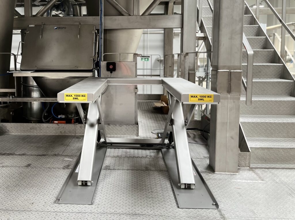 Zostaliśmy poproszeni o zaproponowanie odpowiedniego stołu podnośnego nożycowego do montażu na antresoli, aby ułatwić operatorowi podawanie półproduktów do późniejszego mieszania i ważenia mieszanek mąki i ziarna.