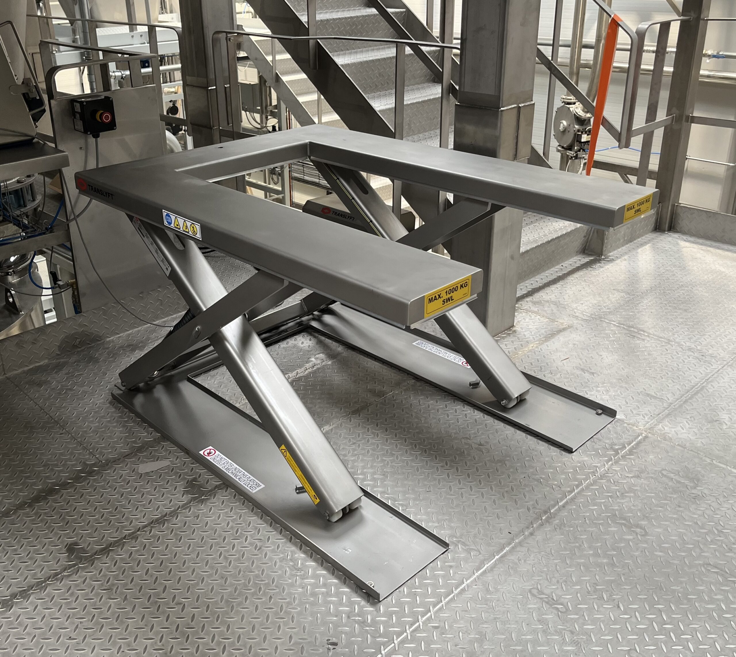 Wybrany, superniski stół podnośny nożycowy TUB1000 został wykończony szklaną piaskowaną stalą nierdzewną AISI304/1.4301 o udźwigu 1000 kg, skoku nożyc 715 mm i całkowitym podniesieniu 800 mm.